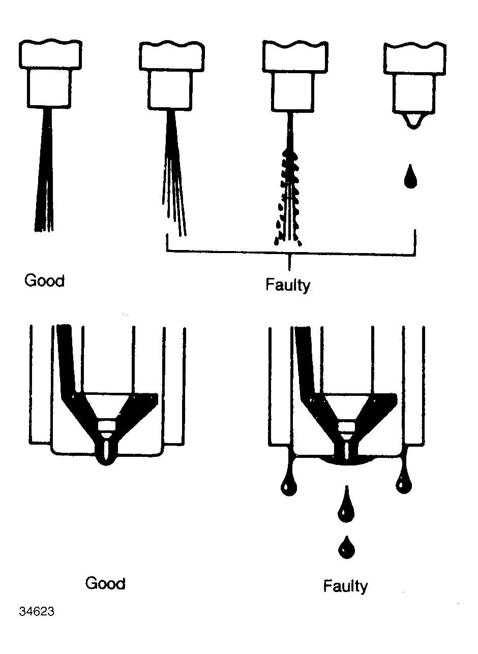 - Maintain pressure at 142-284 psi (10-20 kg/cm2 ) below initial injection pressure. Check that there is no dripping from nozzle tip or around body. See Fig 1 . If there is leakage, overhaul or replace injector.