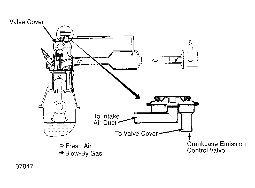 - Remove crankcase emission control valve from valve cover. Apply vacuum to control valve's intake air duct port. See Figure . Check that air flows up through valve's port to valve cover.