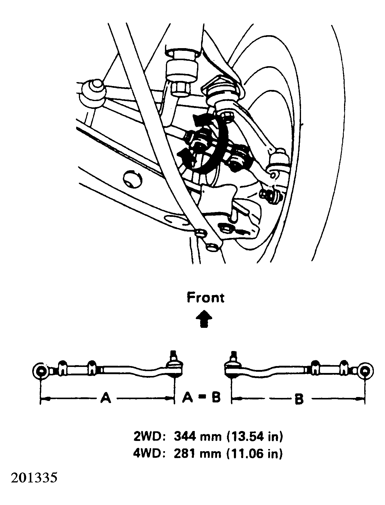 Adjust toe-in by varying the lenght of the steering tie-rods. Adjust toe-in by turning the left and right tie-rod tubes an equal amount. Make sure the tie-rods are screwed into the tie-rod tube more than 1.38" (35 mm).
