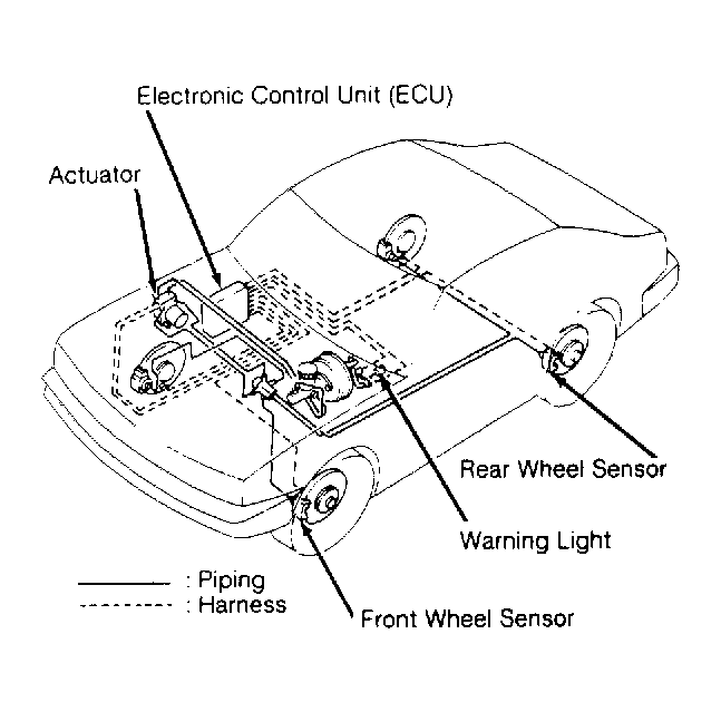 Anti-Lock Brake System (ABS) allows the driver to maintain steering control during heavy braking by fluctuating brake line pressure. System consists of an Electronic Control Unit (ECU) with LED (for diagnostic usage), wheel speed sensors, actuator (electro-hydraulic unit) and an ANTI-LOCK warning light located in dash. See Fig 1 .
