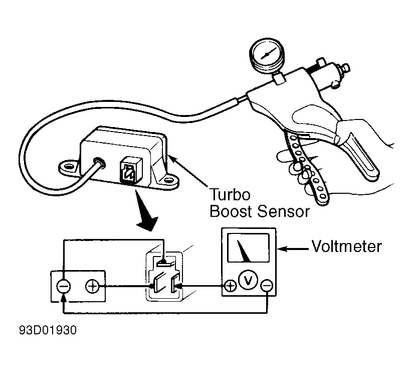 Boost sensor is located in left rear corner of engine compartment. Disconnect sensor connector and hose. Connect 12-volt battery and voltmeter across sensor connector terminals. See Fig 1. Voltage should be about 2.2 volts. Connect a hand-held vacuum pump to sensor hose fitting. Apply 14 Hg. vacuum at hose fitting. Voltage should be about 1.3 volts. If the voltage is not as specified, replace sensor.