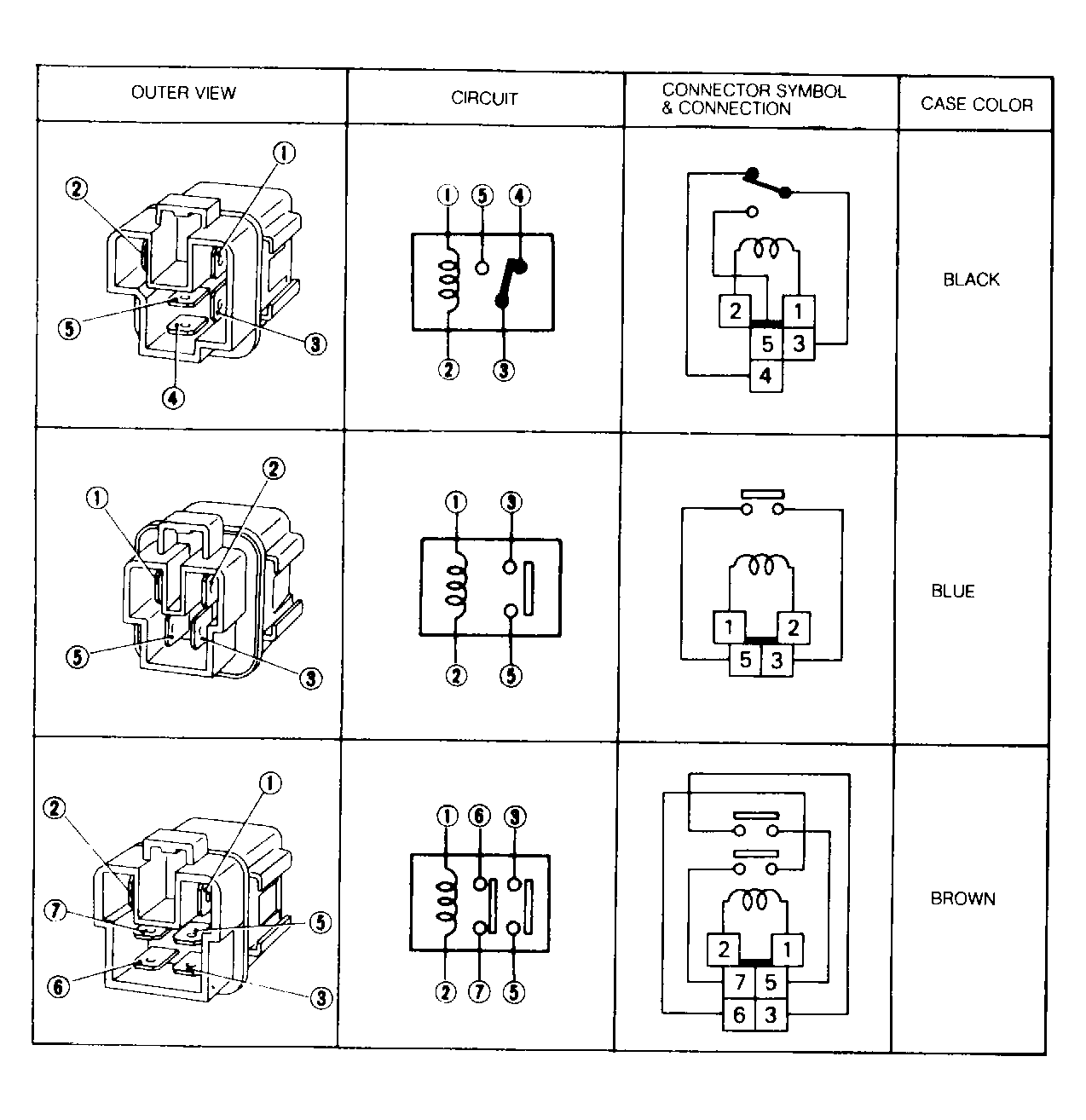 - Test relays by supplying ground and battery voltage across the relay winding of the relay (terminals No. 1 and 2). When relay is energized, continuity should be present between terminals No. 3 and 5, and also terminals No. 6 and 7 of the Brown dual-function relay.