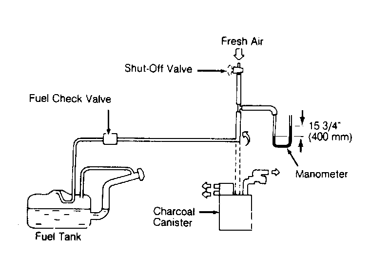 - Check all hoses and fuel filler cap for leaks. Disconnect fuel tank vapor hose at canister. Attach "T" fitting, manometer, and shutoff valve to hose. See Figure .