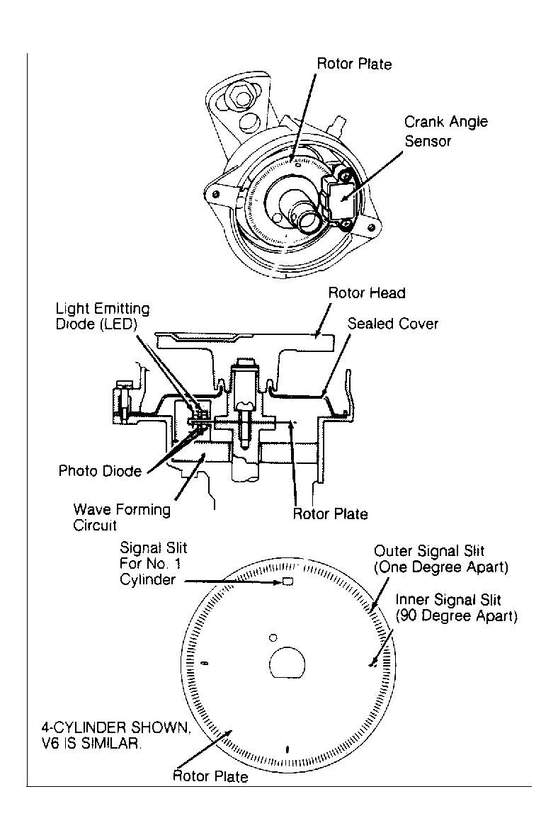 The crankshaft angle sensor monitors engine speed and piston position. The crankshaft angle sensor, which is built into the distributor, has a rotor plate and a wave-forming circuit. The rotor plate has 360 small outer slits (one degree apart) to determine crankshaft angle, and 4 (4-cylinder) or 6 (V6) larger inner signal slits (90 (4-cylinder) or 60 (V6) degrees apart) to determine engine speed. See Figure . The signal slit for the No. 1 cylinder is the largest of the 4 (4-cylinder) or 6 (V6) inner signal slits to allow ECU to determine TDC for No. 1 cylinder.