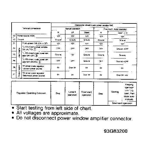 Check power source and ground continuity as indicated in test charts. Check input and output signals. See Fig 1 . Replace driver's window switch/amplifier as necessary.