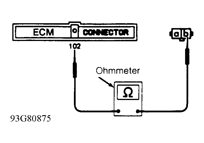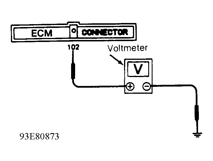 - Check Control Function - If vacuum is not present at about 2000 RPM, measure voltage between ECM terminal No. 102 (Gray wire) and ground. See Figure and Fig 1 . At idle, voltage should be about zero volts. At 2000 RPM, voltage should be battery voltage. If voltage is not as specified, go to next step. If voltage is as specified, inspect vacuum hose for clogging, cracks or proper connection. Repair vacuum hose as necessary.