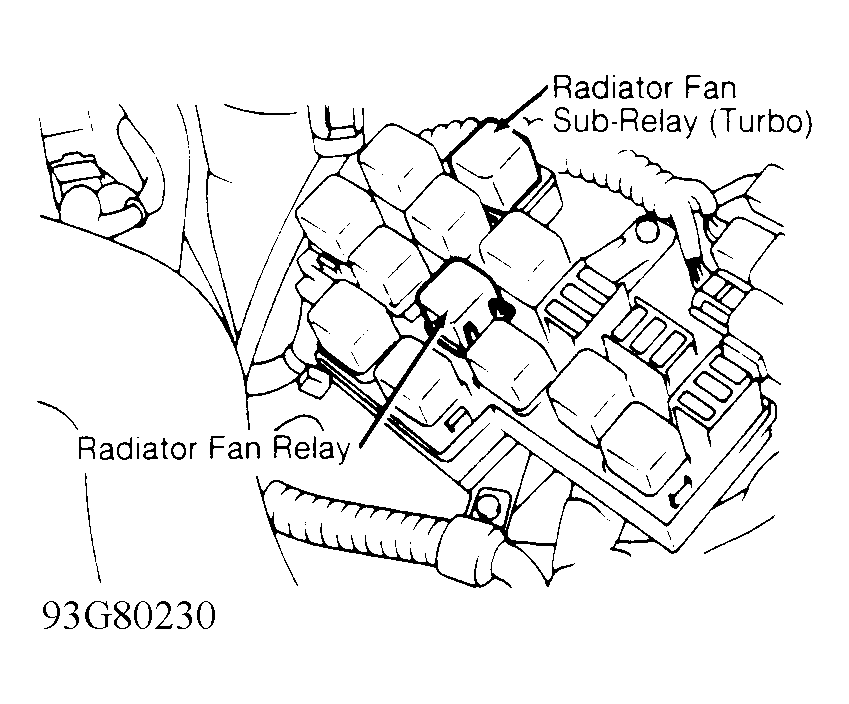 - Turn ignition off. Disconnect radiator fan relay. Turn ignition on. Measure voltage between radiator fan relay terminals "b" (Purple wire) and "d" (Green/White wire). See Fig 1