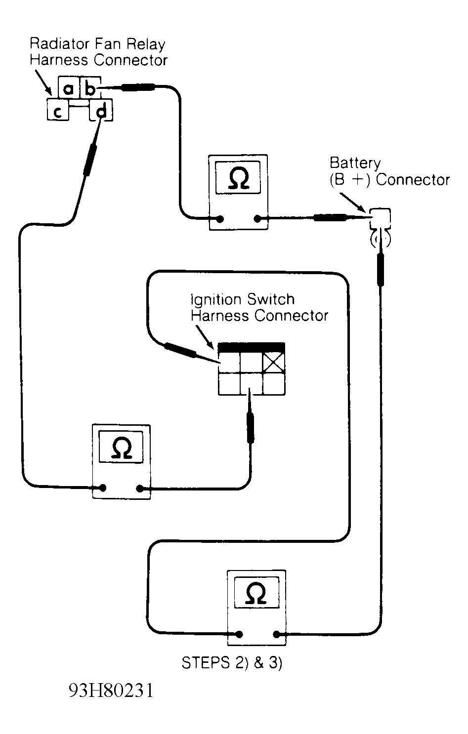 - Check harness continuity between B + terminal at battery and ignition switch. Check harness continuity between ignition switch and radiator fan relay harness connector terminal "d". See Fig 1