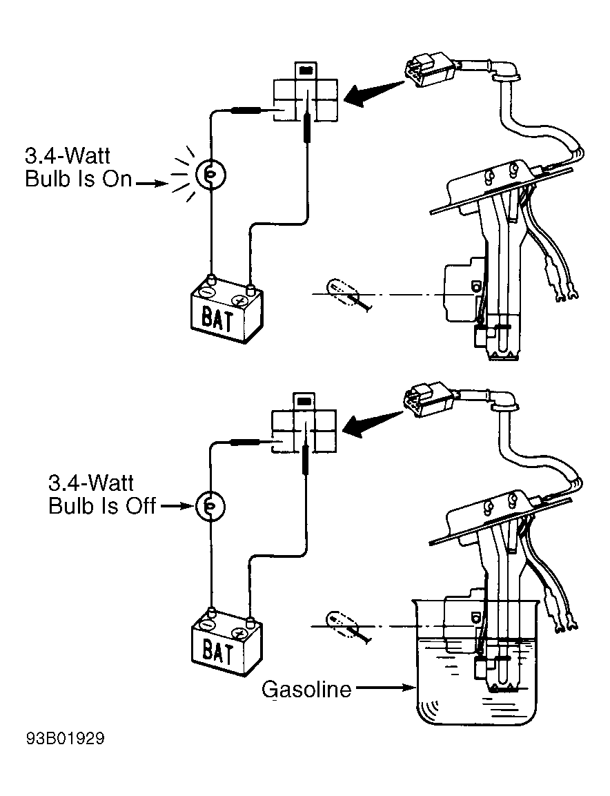 Remove fuel gauge sending unit. Connect a 12-volt battery and a 3.4-watt light bulb, in series, to terminals "E" and "S" of fuel gauge sending unit connector. See Fig 1 . Allow time for light bulb to come on. With sending unit float submerged in gasoline, light should turn off.