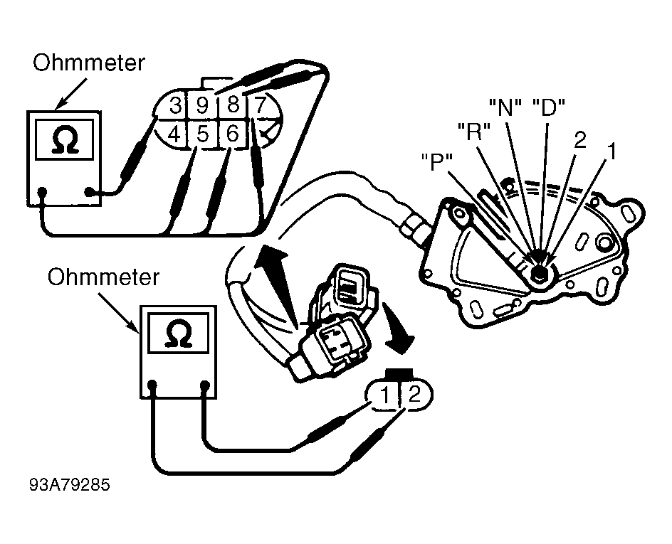 - Disconnect and inspect inhibitor switch 8-pin and 2-pin harness connectors for pushed-out, bent, damaged or corroded terminals. Repair connector(s) as necessary. Connectors are located on side of transmission. Check continuity across terminals of inhibitor switch 2-pin connector. Continuity should exist ONLY in Park and Neutral. If continuity exists in any other position, replace inhibitor switch.