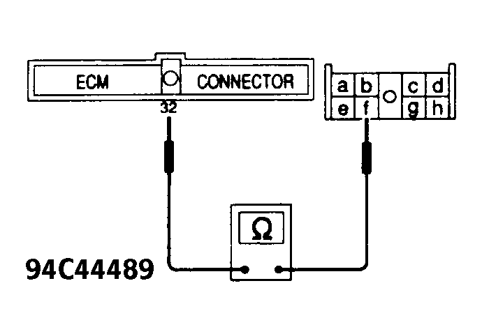 Turn ignition off. Disconnect ECM and combination meter wiring harness connector. Check harness continuity between ECM terminal No. 32 and combination meter terminals "f" (Yellow/Green wire). See Fig 1 . If continuity is present, check ECM pin terminals and connector and repair as necessary. If continuity is not present, repair wiring harness or connectors as necessary and perform FINAL CHECK  .