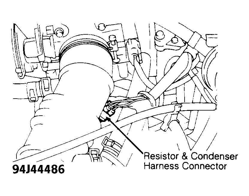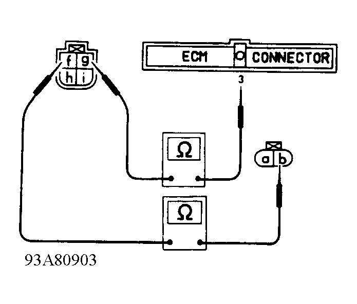 - Check Input Signal - Perform this step if vehicle does not start. Ensure ignition is off. Disconnect ignition coil wiring harness connector. Leave resistor and condenser connected. See Fig 3 . Check continuity between ignition coil harness connector "b" and resistor/condenser connector terminal "f". See Fig 7 . Check continuity between ECM terminal No. "3" and resistor/condenser connector terminal "g". If continuity is present, go to step 4). If continuity is not present, replace resistor and condenser.