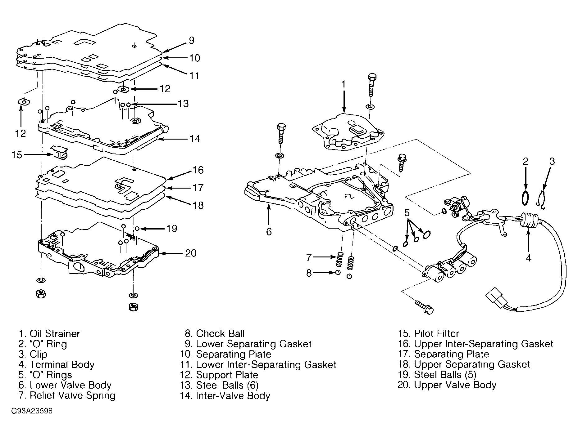 - Remove inter valve body from lower valve body. Turn lower valve body over and remove accumulator support plate. Remove bolts "E", separating plate and separating gasket from lower valve body. See Fig 1. Remove check balls and relief valve springs from lower valve body. DO NOT lose check balls or relief valve springs.