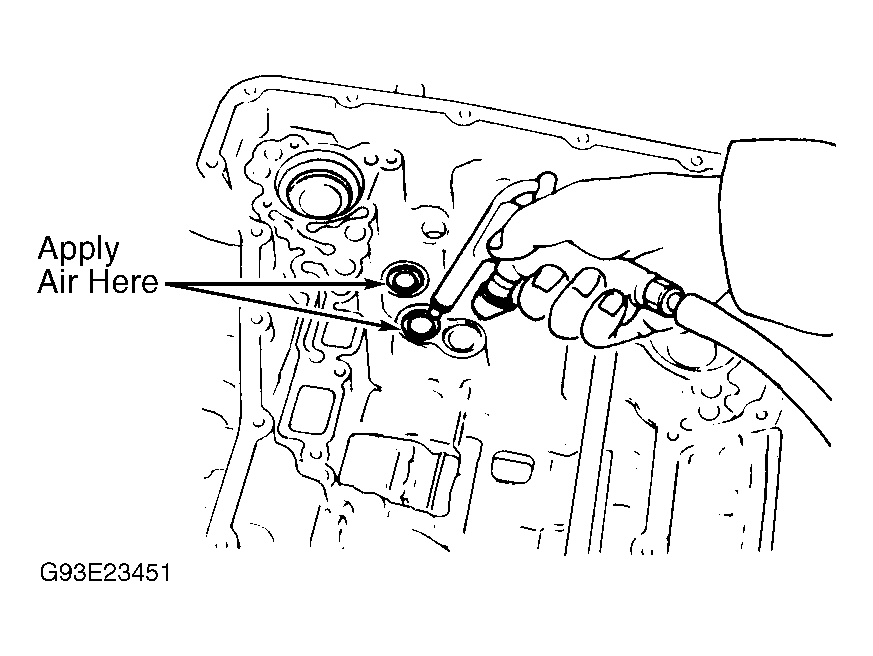 - Tighten oil pump bolts to 13-15 ft. lbs. (18-21 N.m). Apply ATF to input shaft "O" ring and install "O" ring on input shaft. Adjust brake band. Tighten anchor end pin to 35-53 INCH lbs. (4-6 N.m). Back off anchor end pin 2 1/2 turns. While holding anchor end pin, tighten lock nut. Apply compressed air to oil holes in transaxle case to ensure correct brake band operation. See Fig 1.