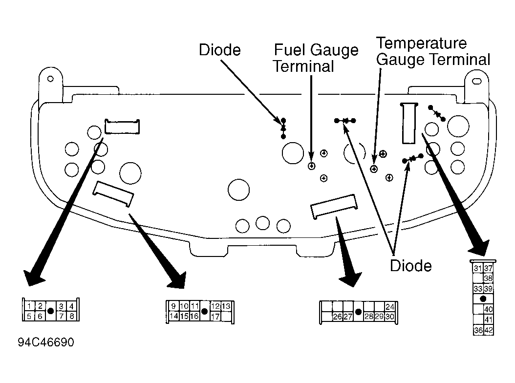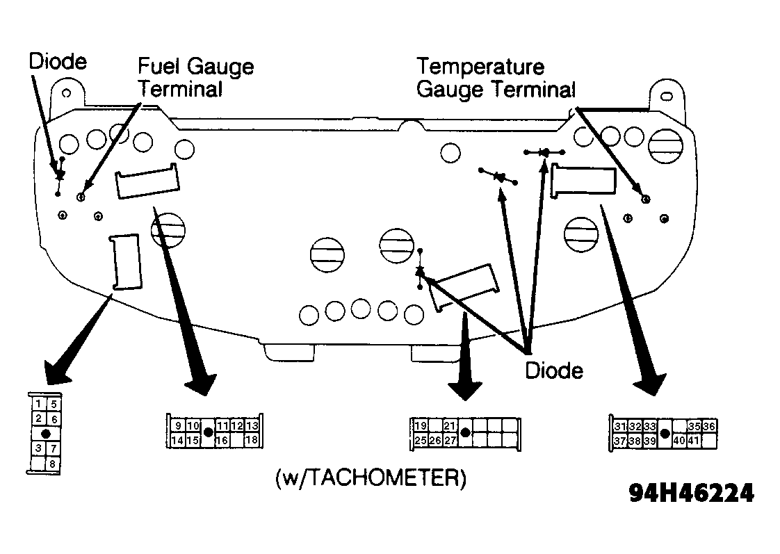 Remove instrument cluster. Turn ignition on. Check voltage between ground and specified terminal of instrument cluster connector. See MAIN POWER SUPPLY TEST TERMINALS table. See Figure and Figure . If battery voltage is not present, check for blown fuse, open fusible link, open wiring harness, faulty ignition relay and/or faulty ignition switch.