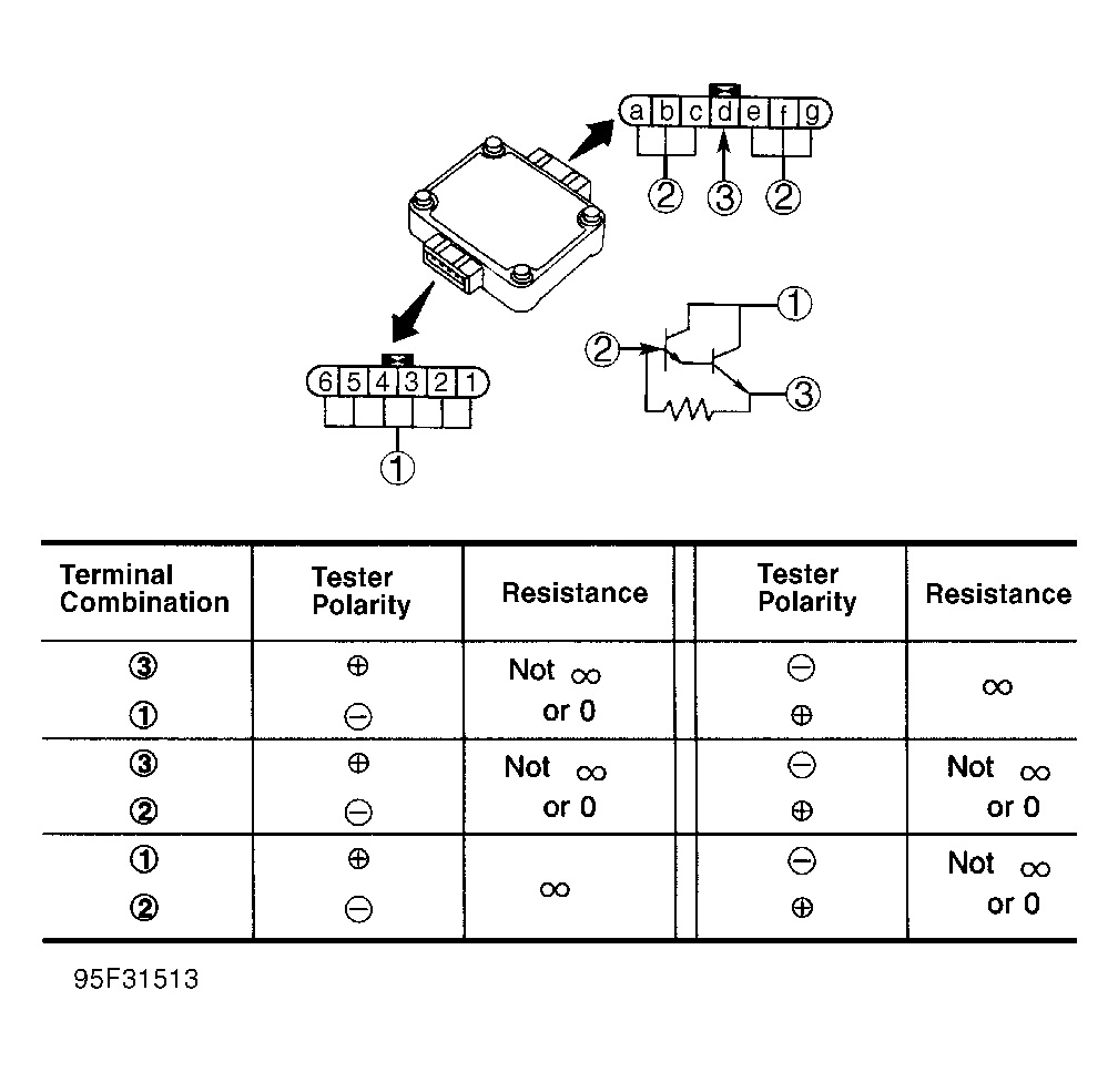 Disconnect power transistor unit connector. Check resistance at each power transistor unit terminal. See Fig 2 . If resistance is no t as specified, replace power transistor.