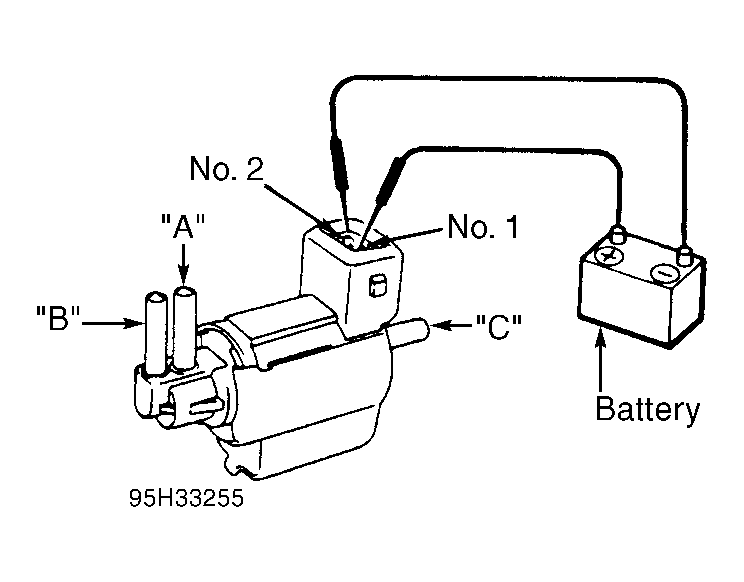 Apply battery voltage and ground to terminals No. 1 and 2. See Fig 1. With battery voltage applied, air should pass between ports "A" and "B". Air should not pass between ports "A" and "C". With no voltage applied, air should pass between ports "A" and "C". Air should not pass between ports "A" and "B". Replace EGR and canister control solenoid valve if not as specified. If solenoid valve is okay, go to next step.