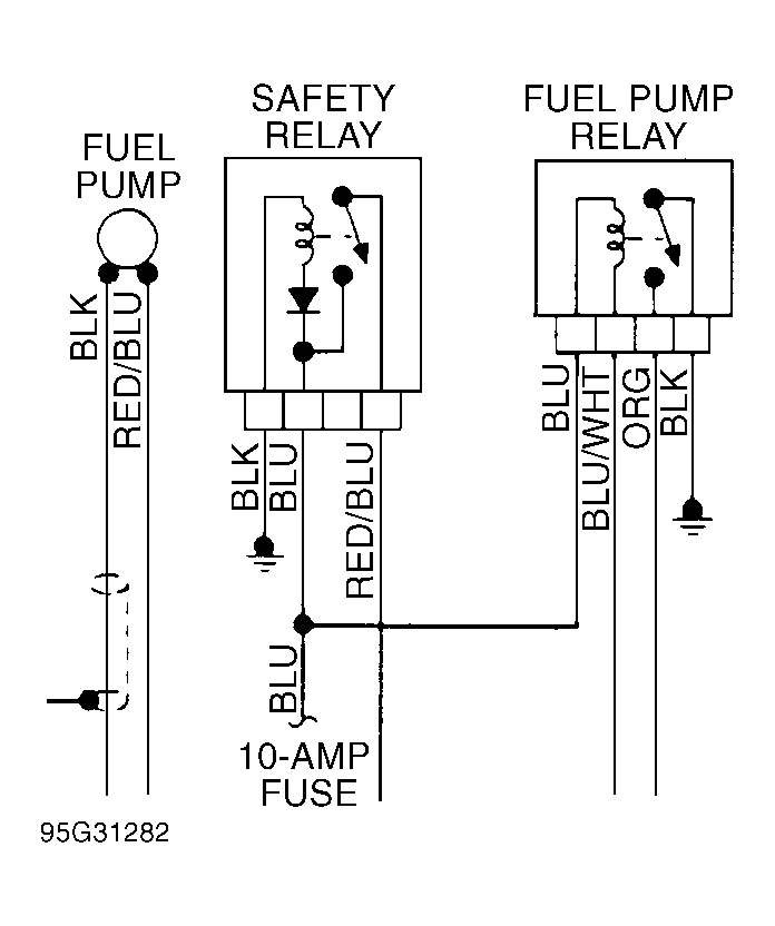 - Turn ignition off. Disconnect safety relay connector. Using ohmmeter, check for continuity across relay's Black wire and Blue wire terminals. Reverse ohmmeter leads. Continuity should only exist in one direction. Connect voltmeter positive lead to Red/Blue wire terminal. Connect negative voltmeter lead to Black wire terminal. Apply battery voltage to Blue wire terminal and ground to Black wire terminal. Voltmeter should show battery voltage while relay is energized.
