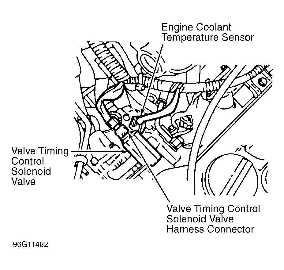 Turn ignition switch to OFF position. Disconnect VTC solenoid valve harness connector. See Fig 1. Turn ignition switch to ON position. Using a voltmeter, measure voltage between VTC solenoid valve harness connector terminal No. 2 (Brown wire) and ground. If battery voltage does not exist, check for blown fuse No. 21 or fault in Brown wire. Repair or replace as required. If battery voltage exists, go to next step.