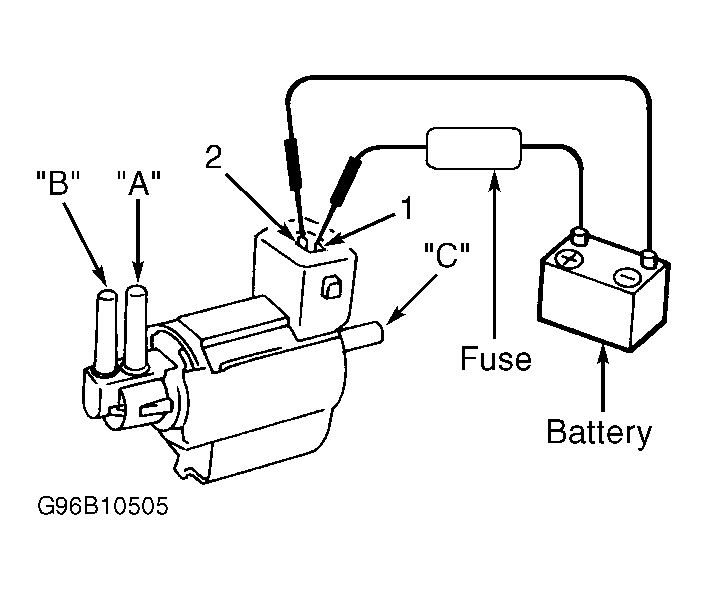 - Check EGRC Solenoid - Disconnect EGRC solenoid. Apply battery voltage and ground to terminals No. 1 and 2. See Figure. With battery voltage applied, air should pass between ports "A" and "B". Air should not pass between ports "A" and "C". With no voltage applied, air should pass between ports "A" and "C". Air should not pass between ports "A" and "B". Replace EGRC solenoid if airflow is not as specified. If solenoid is okay, check vacuum hoses for restrictions or misrouting.