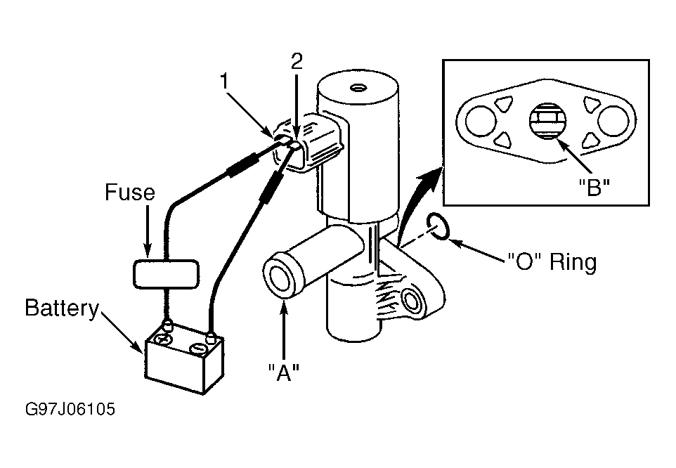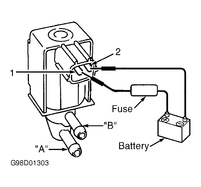 - Remove EVAP-CVCV. Using jumper wires, apply battery voltage and ground to EVAP-CVCV terminals. See Figure. Air should not flow between ports "A" and "B". Remove jumper wires. Air should flow. EVAP-CVCV should switch in one second or less and rust should not exist in port "B". If operation is as specified, go to next step. If operation is not as specified, replace EVAP-CVCV and retest system.
