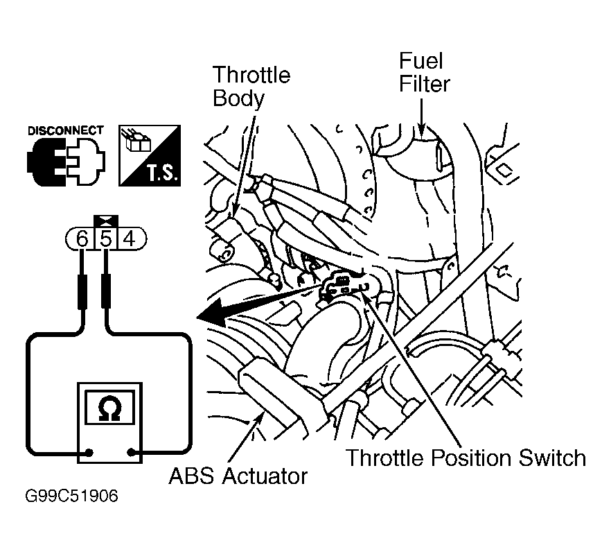 - Turn ignition off. Disconnect TP switch harness connector. Check continuity between TP switch terminals No. 5 and 6. See Figure. Continuity should exist when accelerator pedal is released. Continuity should not exist when accelerator pedal is depressed. If operation is as specified, go to next step. If operation is not as specified, replace TP sensor and retest system.