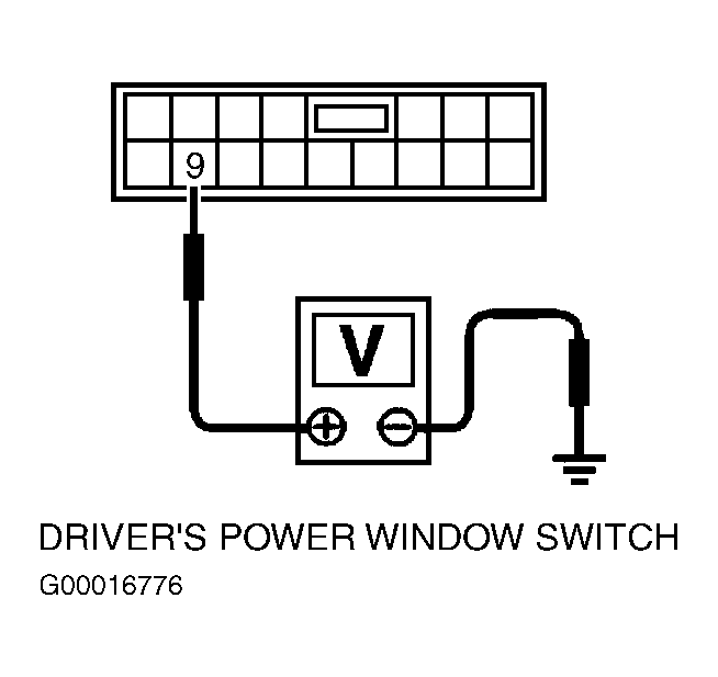 - Connect suspect window regulator connector. Ensure window is fully open. Access power window switch harness connector. Do not disconnect connector. Turn ignition on. Backprobing connector, measure voltage between ground and terminal No. 9. See Fig 1