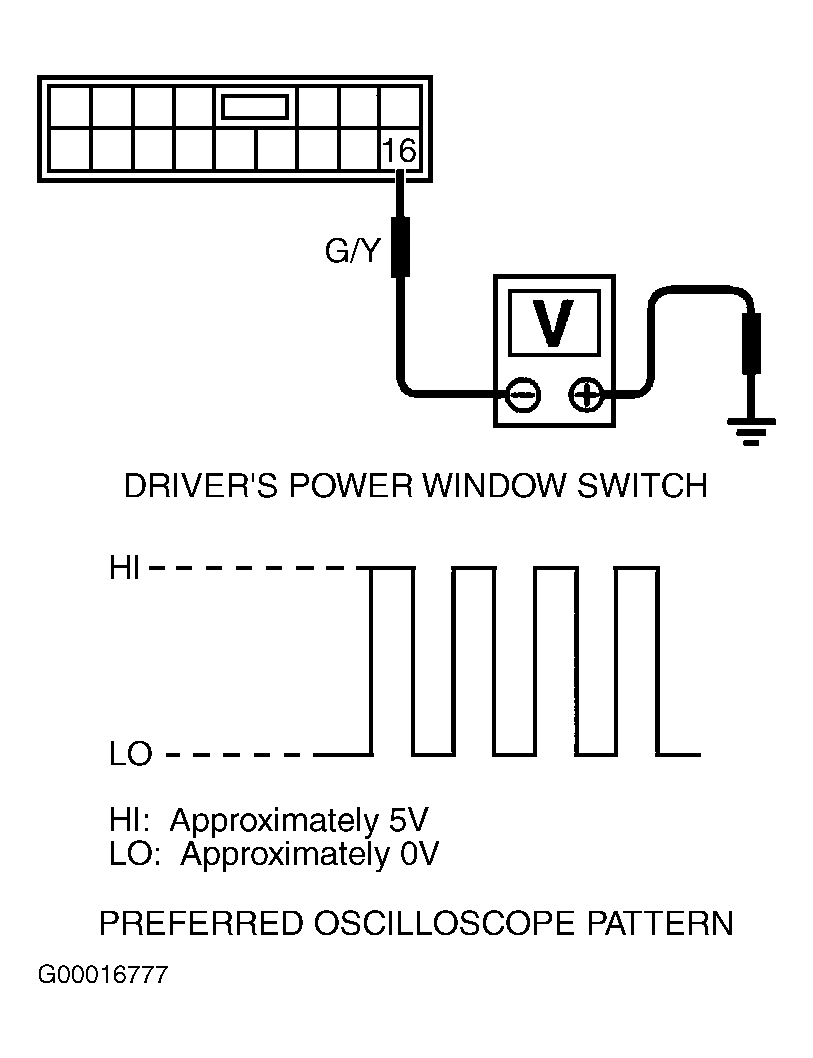 . Raise window using automatic function. Square wave pattern should oscillate between zero to 5 volts. If oscilloscope pattern is as specified, replace power window switch. If oscilloscope pattern is not as specified, replace window regulator motor.