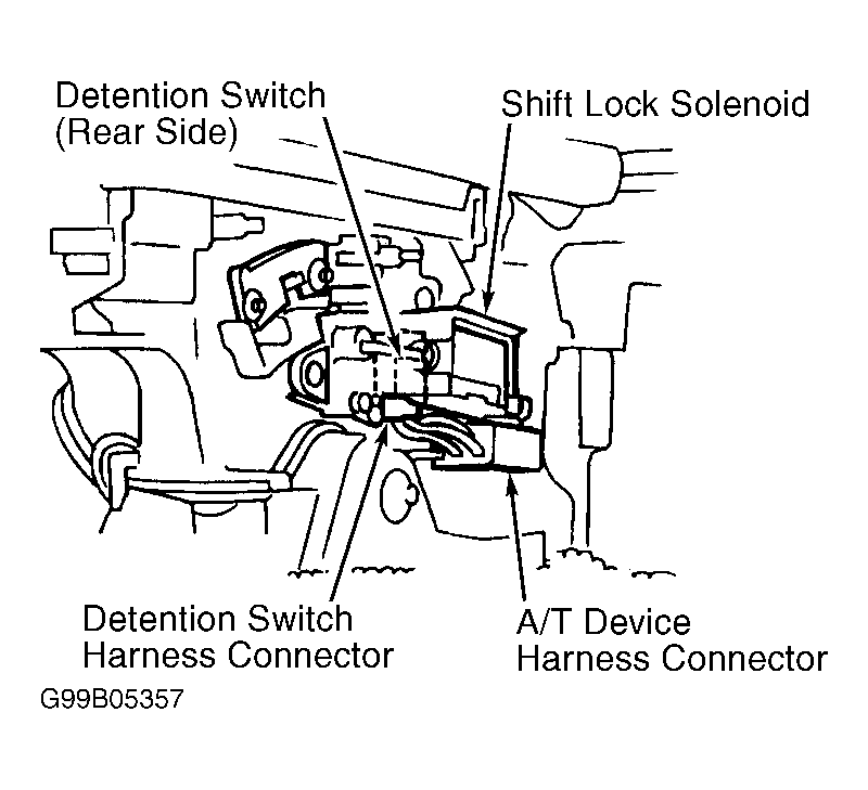 - Disconnect A/T device harness connector, located below selector lever housing. See Figure . Check for continuity between A/T device harness connector terminals No. 5 and 6. Continuity should only exist with selector lever in "P" position and selector lever button depressed or with selector lever in any position other than "P" position and selector lever button released.
