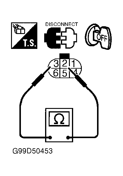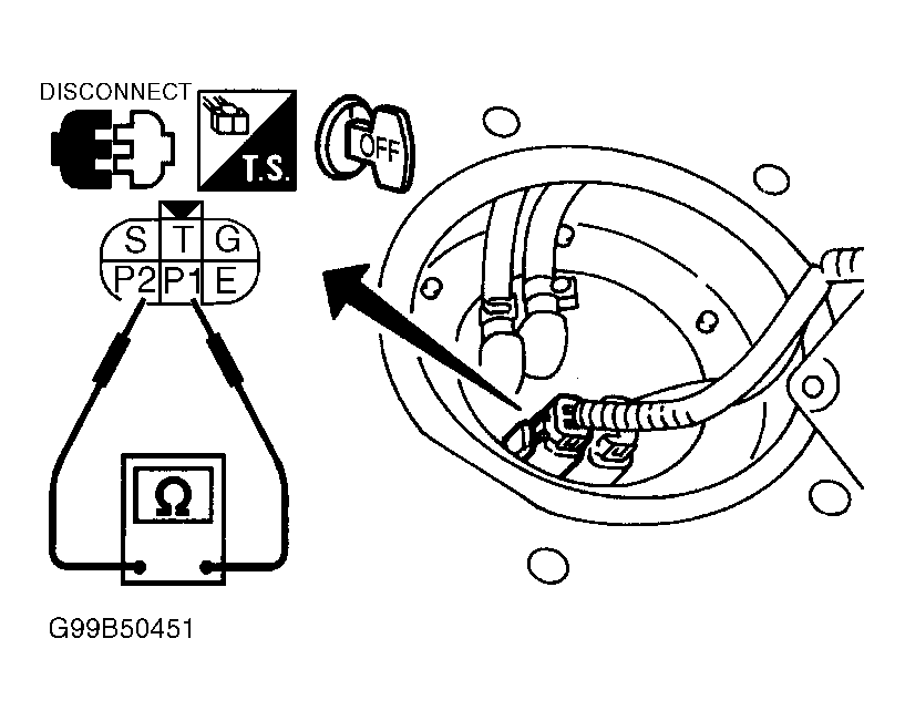 Disconnect fuel pump harness connector. For location, see FUEL PUMP HARNESS CONNECTOR LOCATIONS  table. On Frontier and Xterra 4-cylinder models, measure resistance between fuel pump connector terminals P1 and P2. See Fig 1. On Maxima and Sentra, measure resistance between fuel pump connector terminals No. 1 and 3. See Fig 2. On Quest, measure resistance between fuel pump connector terminals No. 2 and 3. See Fig 3. On all models except Frontier and Xterra 4-cylinder models, Maxima, Quest and Sentra, measure resistance between fuel pump 2-pin connector terminals. On all models, resistance should be 0.2-5.0 ohms at 77°F (25°C). Replace fuel pump, if resistance is not as specified.