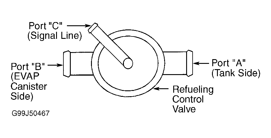 Remove refueling control valve from fuel tank. See VACUUM DIAGRAMS article for location. Inspect control valve for cracks. Blow air into port "A". Air should flow freely out of port "B". See Fig 1. Blow air into port "C". Air should not flow. Apply 2.9 psi (20.00 kPa) of pressure to ports "A" and "C". Air should not escape from port "B". If operation is not as specified, replace control valve. If operation is as specified, test is complete.