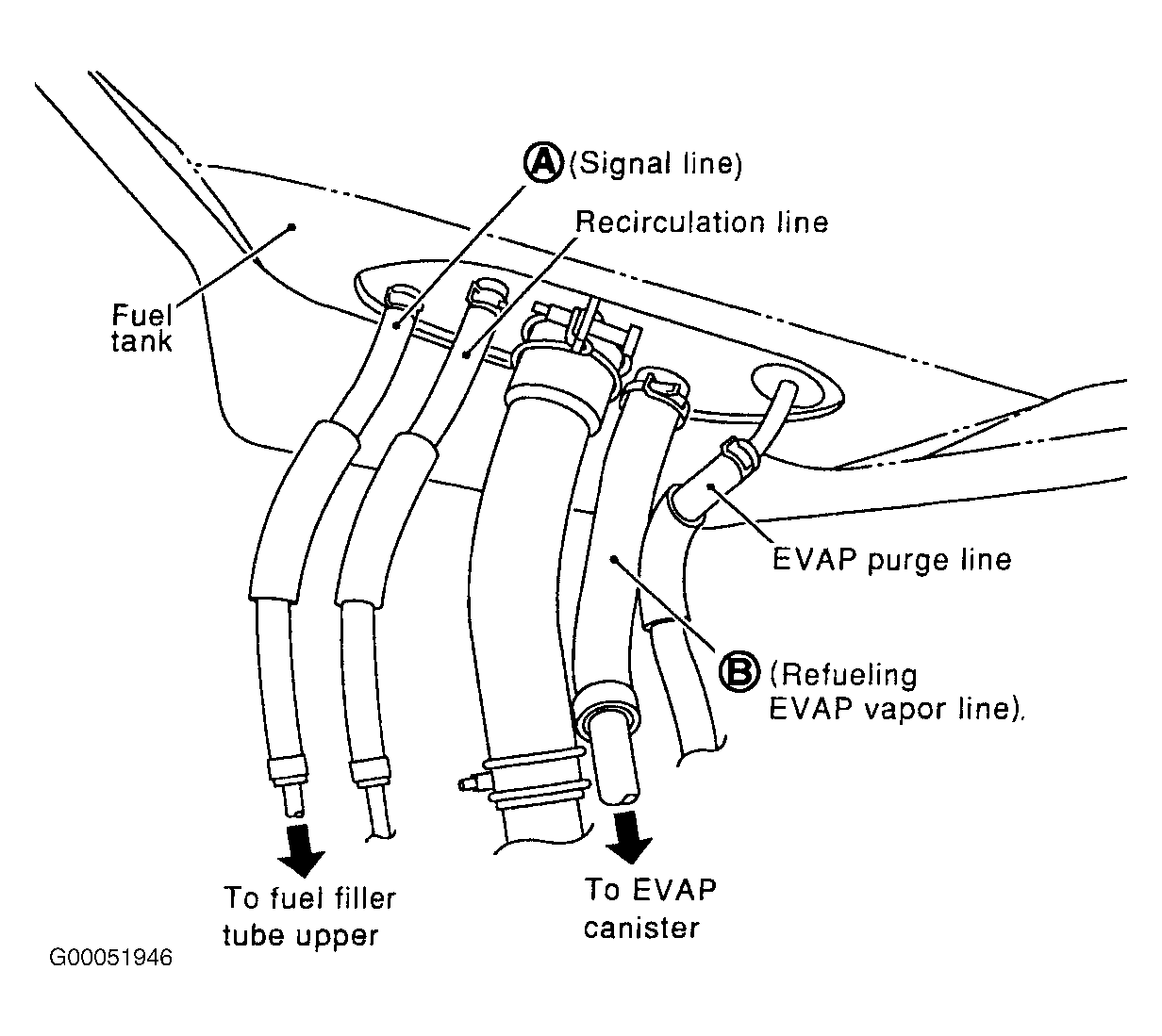 Remove fuel filler cap. Blow air into hose "B". See Fig 1, Fig 2 or Fig 3 . Air should flow freely into fuel tank. Blow air into hose "A". Air should not flow. Using a hand pressure pump with a vacuum "T", apply 2.9 psi (20 kPa) of pressure to hoses "A" and "B". Air should not escape. If operation is not as specified, replace fuel tank with refueling control valve. If operation is as specified, refueling control valve is okay.
