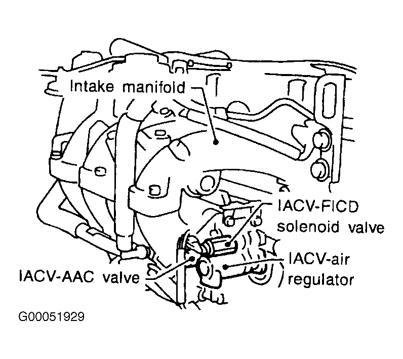 6. Check IACV-FICD solenoid valve. See IDLE AIR CONTROL VALVE-FAST IDLE CONTROL DEVICE SOLENOID VALVE . Replace IACV-FICD solenoid valve, if necessary. If IACV-FICD solenoid valve is okay, go to next step.