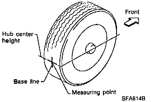 3. Put a mark on base line of the tread (rear side. of both tires at the same height of hub center. This mark is a measuring point.
