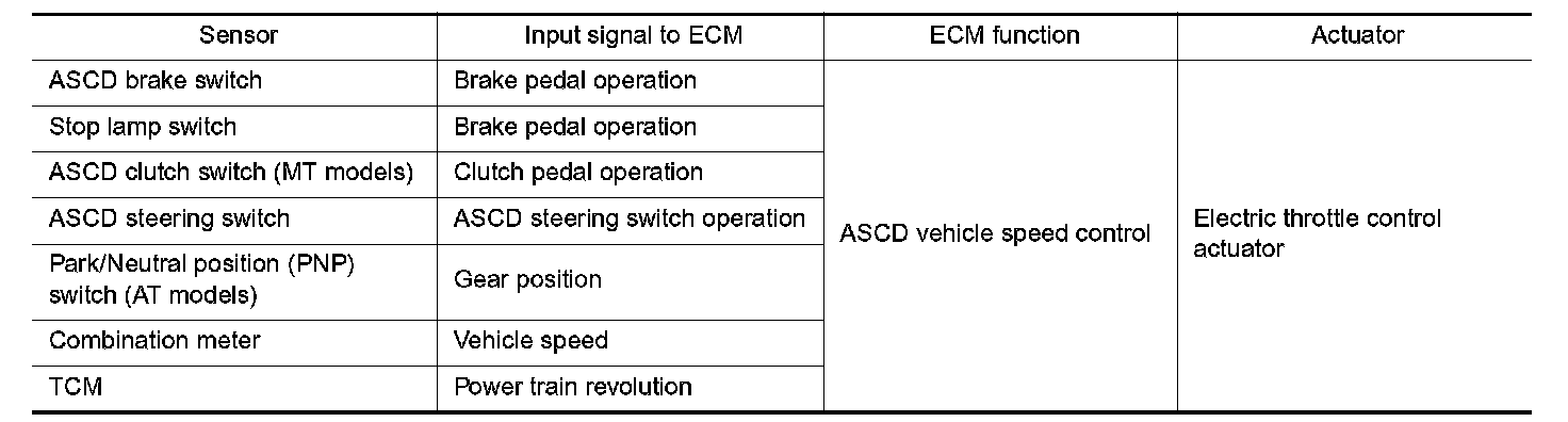 Operation status of ASCD is indicated by CRUISE indicator and SET indicator in combination meter. If any malfunction occurs in ASCD system, it automatically deactivates control.