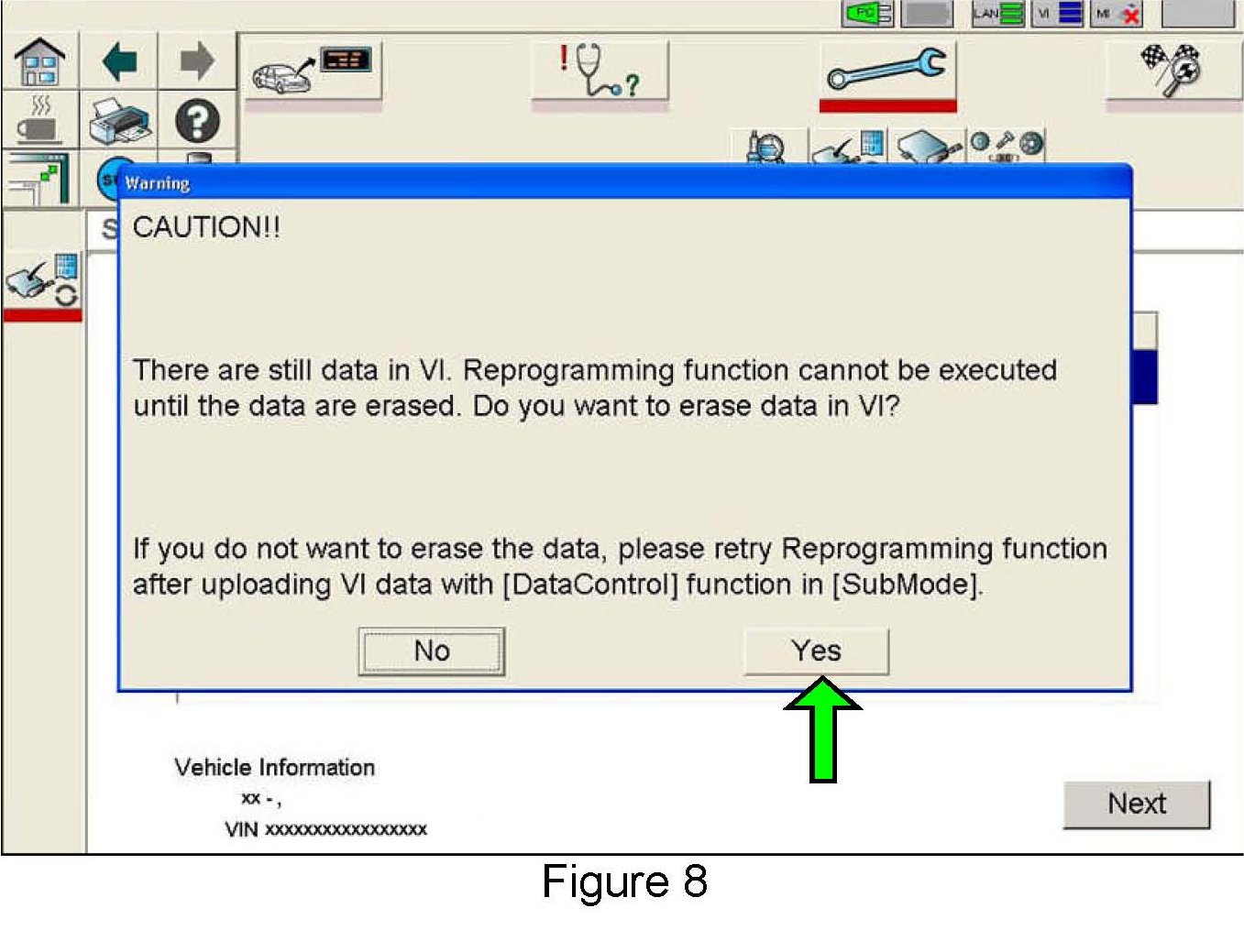 If the screen in Figure 8 appears, there is data stored in the VI. Select "Yes" to proceed with Reprogramming.