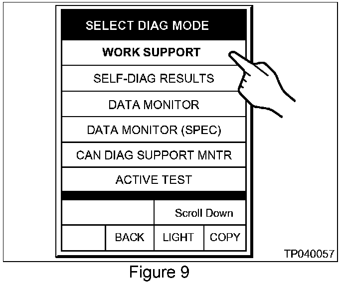 b. Select [WORK SUPPORT] on the "Select Diag Mode" screen. See Figure 9.