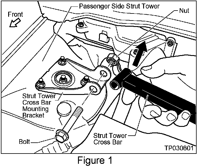 a. Remove the nut/bolt that holds the Strut Tower Cross Bar to the Strut Tower Cross Bar Mounting Bracket (see Figure 1).