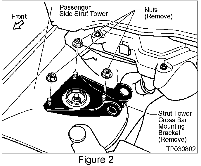 c. Take off three Nuts and remove the Strut Tower Cross Bar Mounting Bracket (see Figure 2).