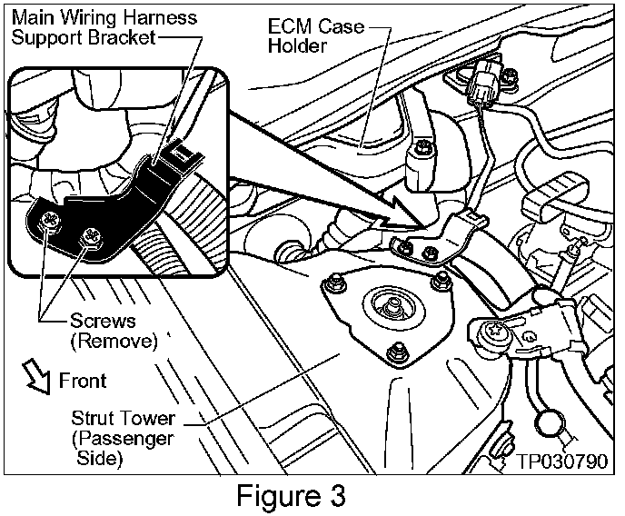 2. Remove two Screws that hold the Main Wiring Harness Support Bracket to the Strut Tower (see Figure 3).