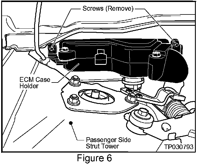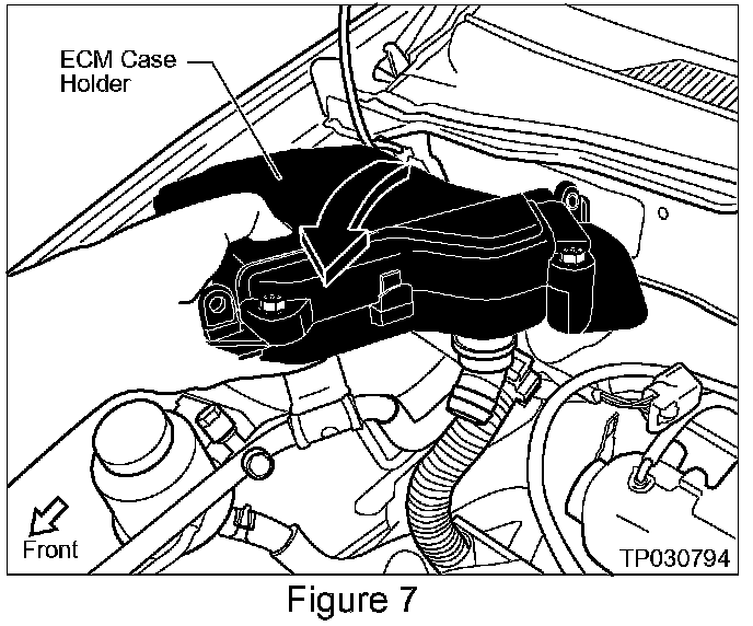 7. Carefully pull the ECM Case Holder out of the engine room wall and set it on top of the passenger side Strut Tower (see Figure 7).