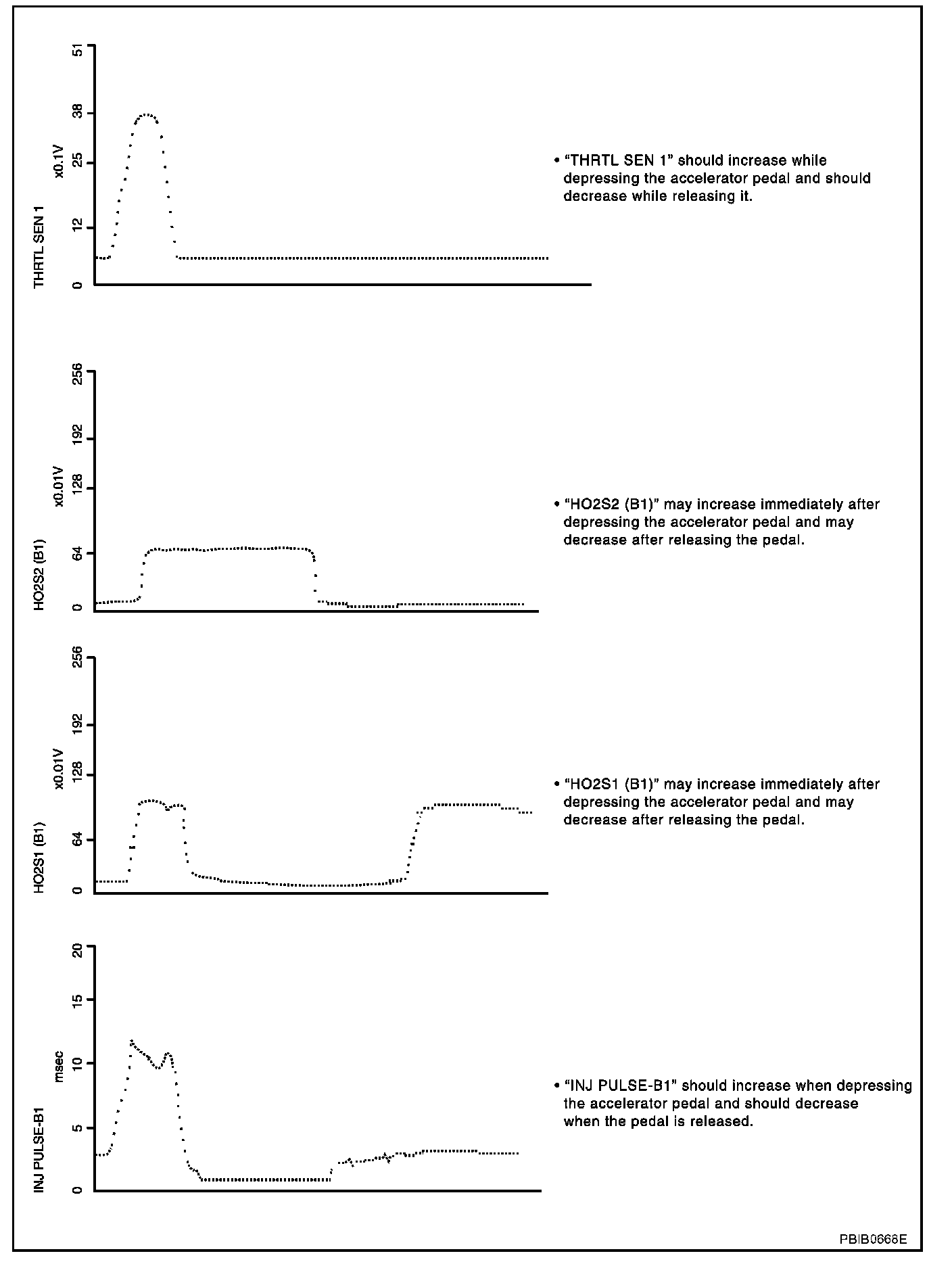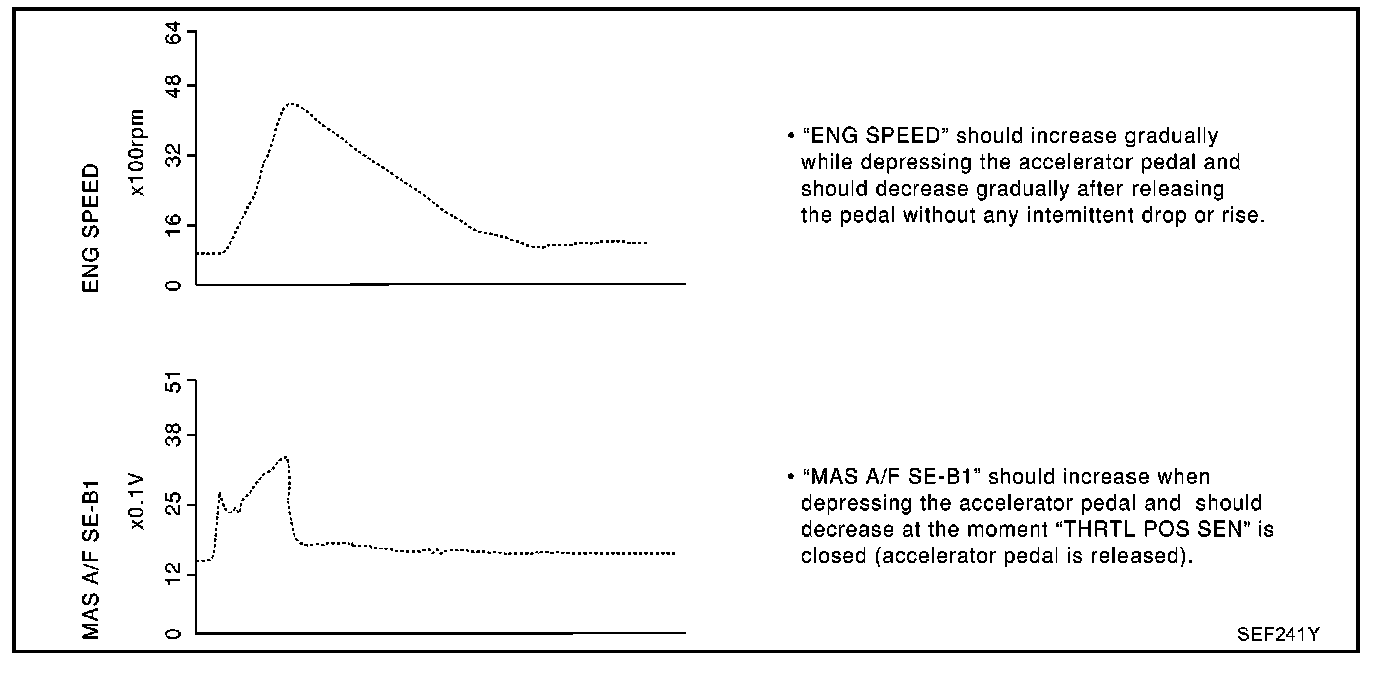 Shown is the data for "CLSD THL POS", "ACCEL SEN 1" and "THRTL SEN 1" when depressing the accelerator pedal with the ignition switch "ON" and with selector lever in "D" position (A/T models) or with shift lever in "1st" position (M/T models).