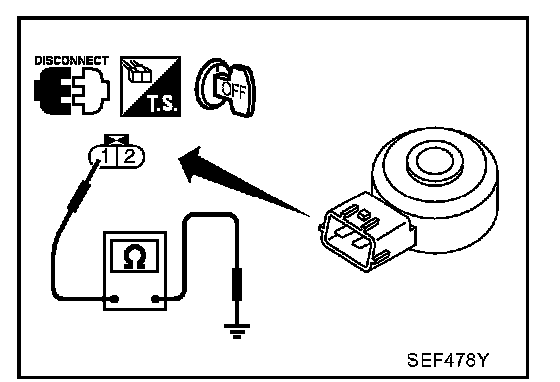 Check resistance between knock sensor terminal 1 and ground.