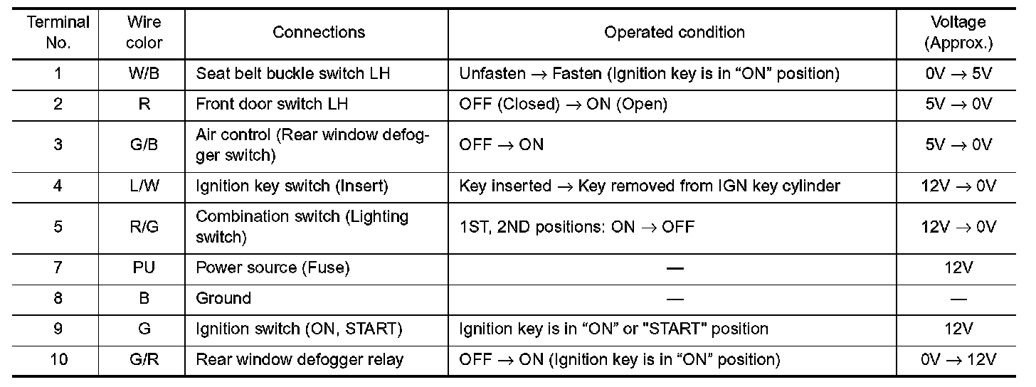 Time Control Unit Inspection Table (Without Power Door Locks) (Terminal No. 1 - 10):