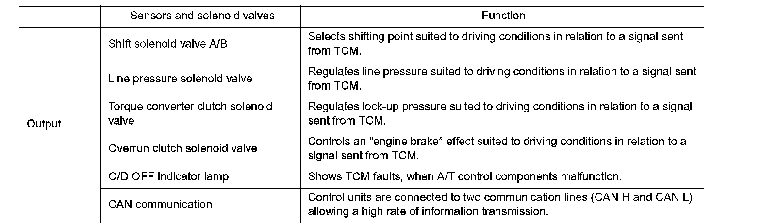 The automatic transaxle senses vehicle operating conditions through various sensors. It always controls the optimum shift position and reduces shifting and lock-up shocks.