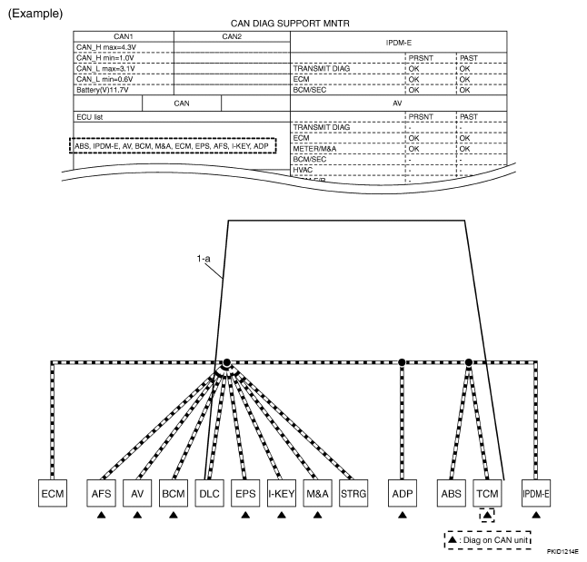 - Reception item of "EPS" and "INTELLIGENT KEY": "UNKWN" is not indicated. This indicates normal communication between EPS and I-KEY and their receiving units. Do not draw any line.NOTE: On CAN DIAG SUPPORT MNTR (without PAST), "UNKWN" is indicated even though the item is not used in the trouble diagnosis. For the details of each item on CAN diagnostic support monitor, refer to "CAN DIAGNOSTIC SUPPORT MONITOR ".