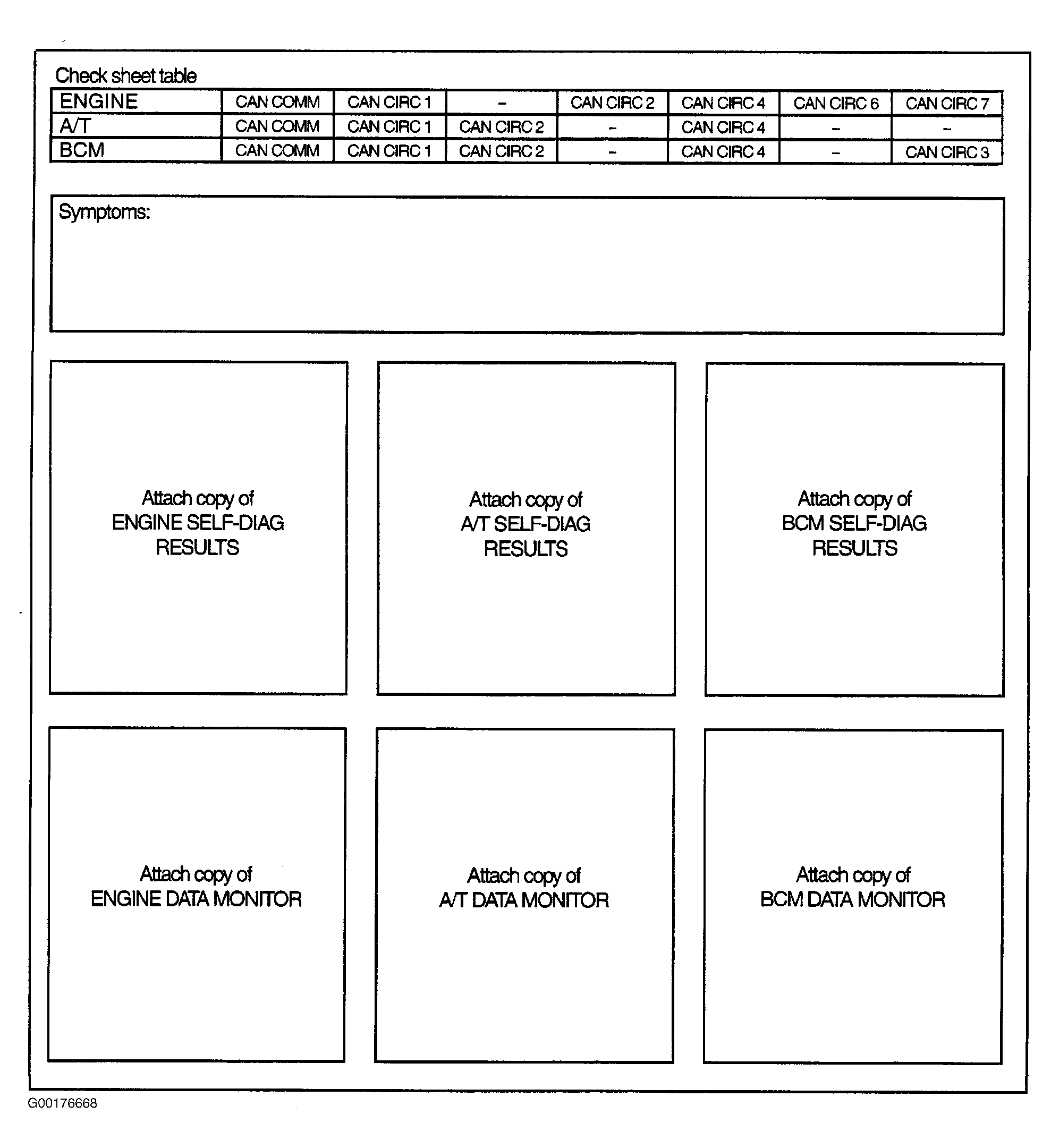 Print all the data of SELF-DIAG RESULTS and DATA MONITOR for "ENGINE", "A/T" and "BCM" displayed on CONSULT-II. See SELF-DIAGNOSTIC RESULTS MODE (WITH A/T 2.5L)  and DATA MONITOR MODE (WITH A/T 2.5L)  and ENGINE SELF-DIAGNOSTIC RESULTS MODE (3.5L)  and ENGINE DATA MONITOR MODE (3.5L)  for "ENGINE", A/T SELF-DIAGNOSTIC RESULTS TEST MODE  for "A/T" and USING CONSULT-II in BODY CONTROL MODULE - ALTIMA, for "BCM". Attach the printed sheet of "SELF-DIAGNOSTIC RESULTS" and "DATA MONITOR" onto the check sheet. See Fig 1 . Based on the data monitor results, put "Check" marks onto the items with "UNKWN" or "NG" in the check sheet table. See Fig 1 . According to the check sheet results (example), start inspection. See Fig 2 and Fig 3 . Based on the data monitor results, put check marks onto the items with "UNKWN" or "NG" in the check sheet table.