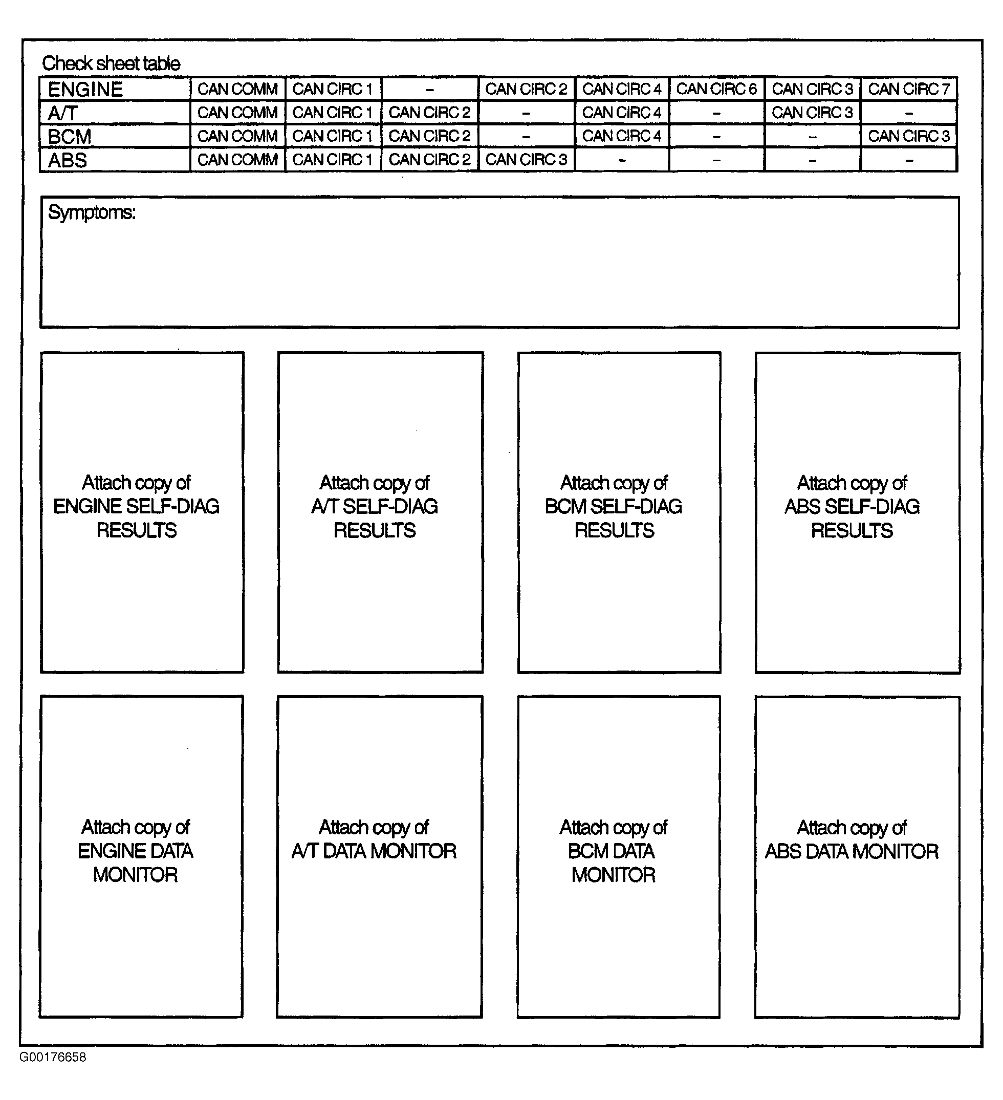 Print all the data of SELF-DIAGNOSTIC RESULTS and DATA MONITOR for "ENGINE", "A/T", "BCM" and "ABS" displayed on CONSULT-II. See ENGINE SELF-DIAGNOSTIC RESULTS MODE (3.5L)  and ENGINE DATA MONITOR MODE (3.5L)  for "ENGINE", A/T SELF-DIAGNOSTIC RESULTS TEST MODE  for "A/T", USING CONSULT-II in BODY CONTROL MODULE - ALTIMA, for "BCM" and ABS SELF-DIAGNOSIS PROCEDURE  and ABS DATA MONITOR PROCEDURE  for "ABS". Attach the printed sheet of "SELF-DIAGNOSTIC RESULTS" and "DATA MONITOR" onto the check sheet. See Fig 1 . Based on the data monitor results, put "Check" marks onto the items with "UNKWN" or "NG" in the check sheet table. See Fig 1 . According to the check sheet results (example), start inspection. See Fig 2 -Fig 4 . Based on the data monitor results, put check marks onto the items with "UNKWN" or "NG" in the check sheet table.