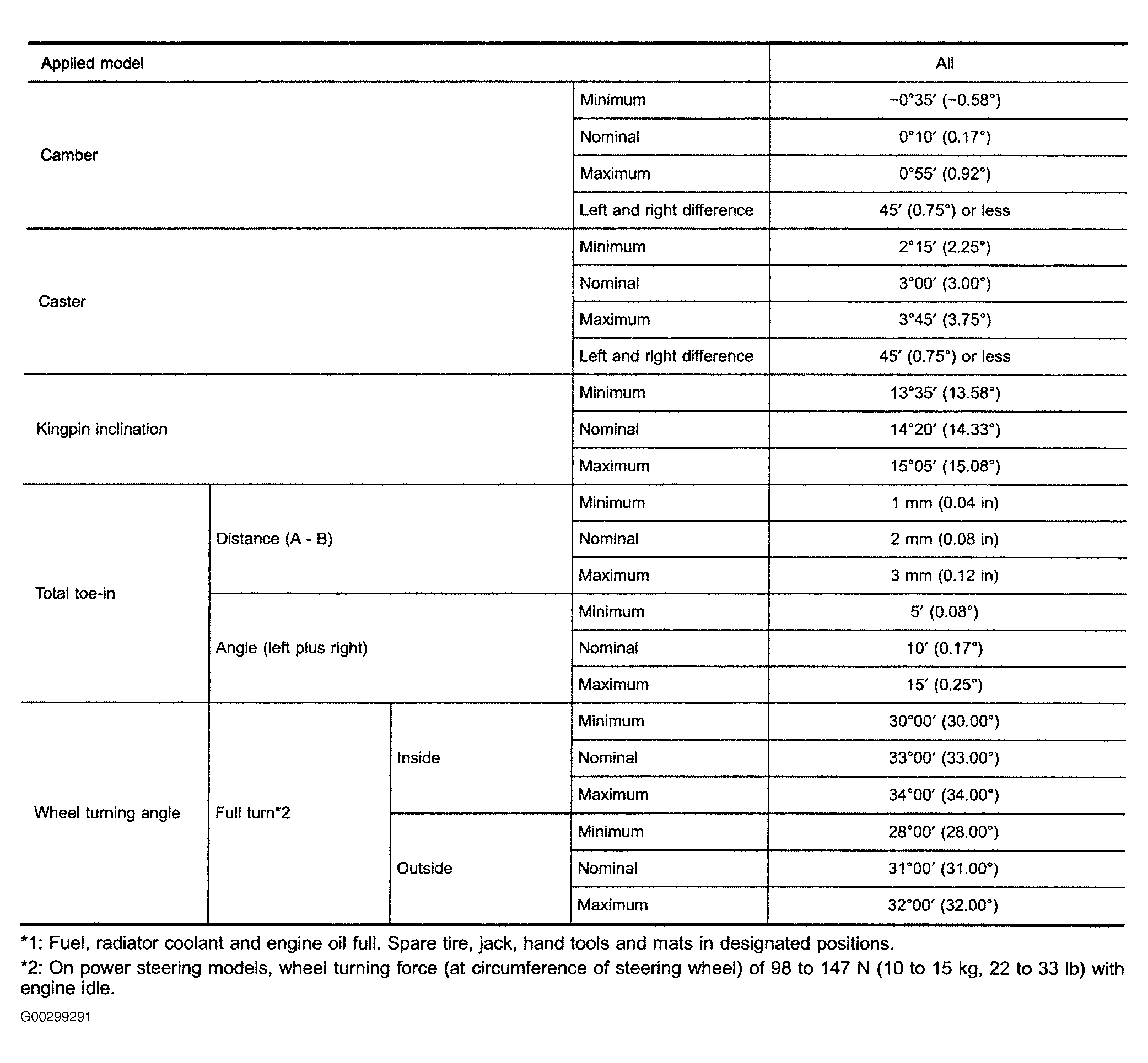 Fig 1: Front Wheel Alignment Specifications (Pathfinder)