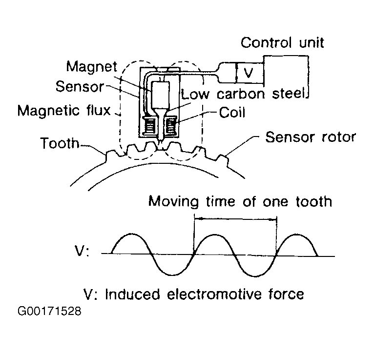 The wheel speed sensor unit consist of a gear shaped sensor rotor and a sensor element. The element contains a bar magnet around which a coil is wound. The sensor is installed on the back side of the brake rotor. A/C current is generated by the sensor as the wheel rotates. The frequency and voltage increase as the rotating speed increases. See Fig 1 .